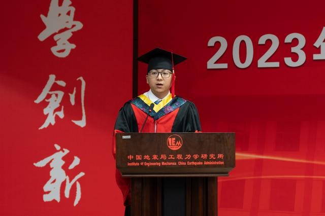 2019級博士生沈俊凱代表畢業(yè)生發(fā)言。他表示會牢記所訓精神,用工力所賦予的知識與智慧去創(chuàng)造美好未來。