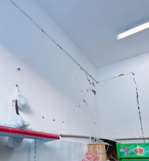 圖1 某框架結(jié)構(gòu)填充墻與梁間出現(xiàn)裂縫、墻體自身出現(xiàn)斜裂縫