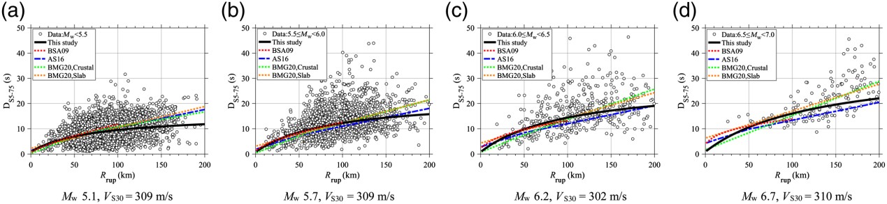 發(fā)布時(shí)間: 2023-04-11 點(diǎn)擊數(shù)量:103043)當(dāng)斷層距大于100 km時(shí),持時(shí)的SVR-GMMs預(yù)測(cè)結(jié)果小于BMG20(圖4)。當(dāng)M<5.5時(shí),顯著持時(shí)隨距離衰減存在明顯的遠(yuǎn)場(chǎng)飽和現(xiàn)象,顯著持時(shí)的飽和距離為100 km。本文開(kāi)發(fā)的SVR-GMMs有效地捕捉到了顯著持時(shí)存在的這一區(qū)域衰減特征。