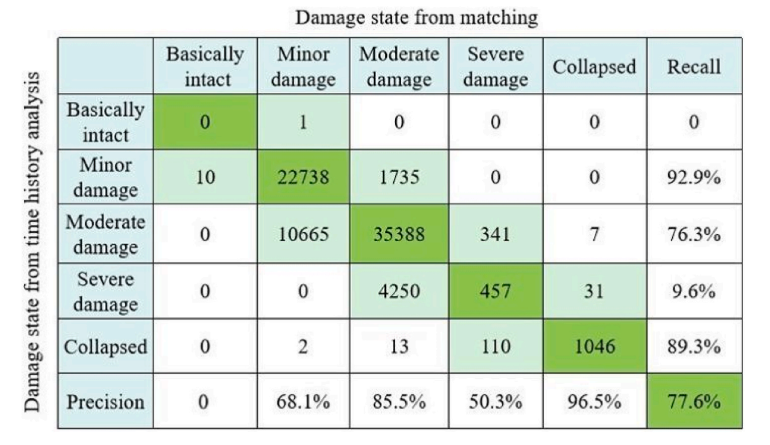 采用基于多波拼接法的建筑群地震災害情景快速匹配方法對位于我國西部設防烈度8度區的某城市進行了建筑群震害的快速構建。該城市模型包含76794棟建筑。選擇PGA為341cm/s2的El-centro波,并考慮區域內的地震衰減關系。區域內地震動輸入的PGA分布如圖1。分別采用時程分析和基于多波拼接法的震害情景快速匹配方法獲取結構地震損傷指數,分別如圖2和圖3所示。可以看出,結構損傷程度的分布相近。損傷指數平均匹配誤差為15.7%,匹配誤差小于30%的結構占比為91.4%。損傷狀態的混淆矩陣如圖4,損傷狀態匹配一致的概率為77.7%。相比時程分析,本文方法所需的時間減少約90%。