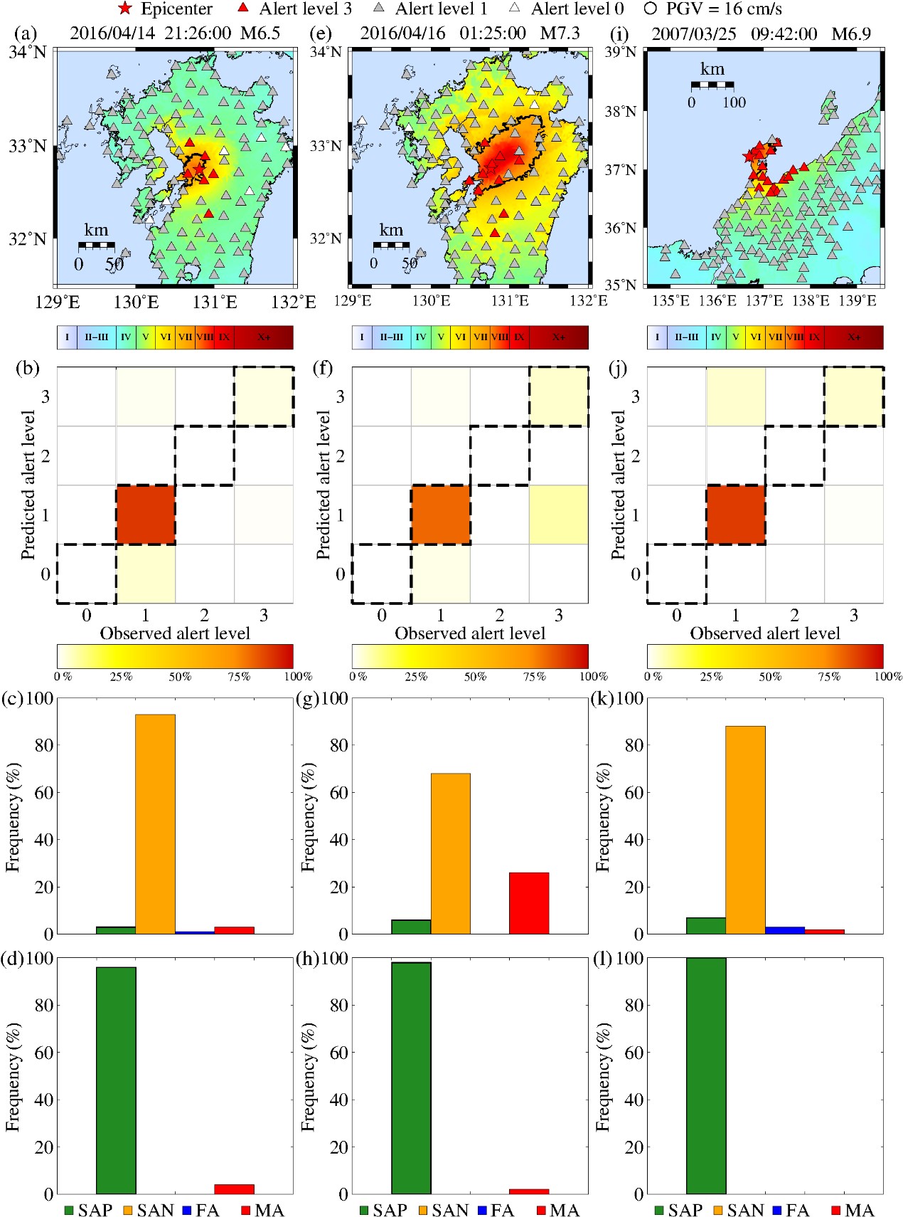 1)利用日本K-net強震觀測加速度數據建立訓練、測試、驗證數據集,構建了基于多特征輸入和機器學習支持向量機(SVM)的震級估計和峰值速度(PGV)預測方程。這兩種預測方程分別稱為估計震級的SVM-M模型和預測PGV的SVM-PGV模型。設置預測震級閾值和PGV閾值分別為M=5.7和PGV=9.12 cm/s,當預測震級或PGV值超過給定閾值時,會在不同的記錄點發出不同的警報級別(0、1、2、3)。警報級別3表示預測的震級和預測的PGV都超過給定的閾值,并且該記錄站點可能會受到嚴重破壞。(圖1)