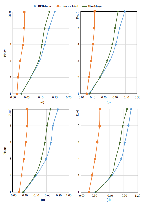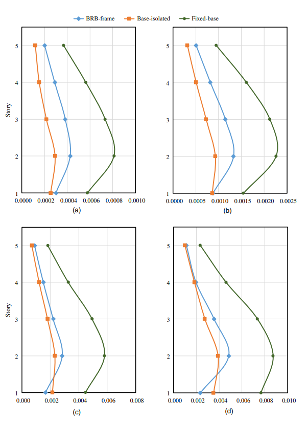 2)結構響應分析結果(圖2)顯示,與普通框架結構相比,BRB-框架結構與隔震結構在各個強度等級的地震下層間位移角均降低了40%-60%;隔震結構的頂層樓層加速度降低了45%,而BRB-框架結構頂層的樓層加速度增大25%。