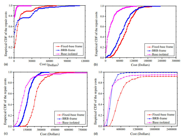 依據FEMA P-58抗震性能評估理論,選擇基于強度的評估方法,對比了普通框架結構、BRB-框架結構、隔震框架結構在四個地震動強度下的結構響應情況及地震性能評估與損失進行了對比評估。
