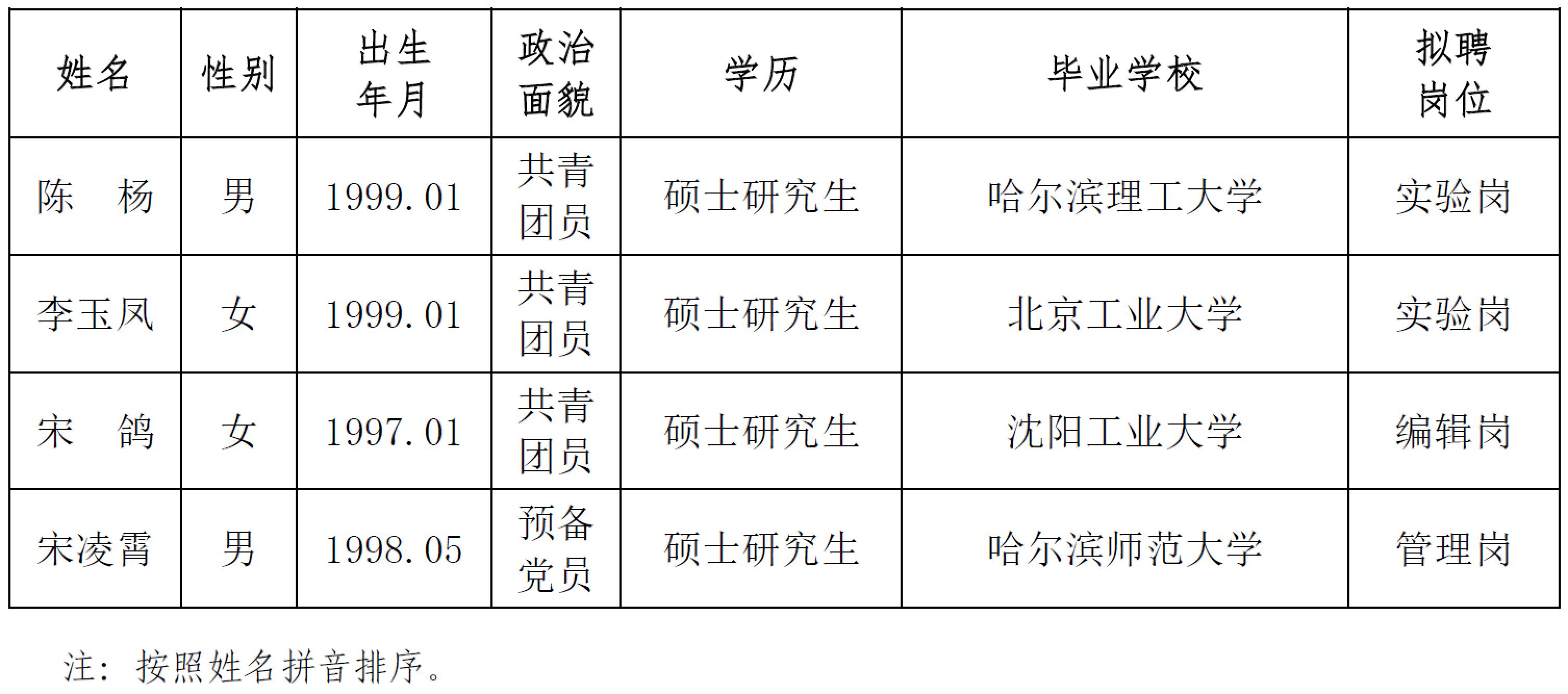 發(fā)布時間: 2024-05-14 點擊數(shù)量:15566根據(jù)中國地震局《關(guān)于貫徹執(zhí)行〈事業(yè)單位公開招聘人員暫行規(guī)定〉的通知》文件精神和我所用人計劃,經(jīng)公開發(fā)布招聘信息、資格審查、面試等程序確定擬錄人員。現(xiàn)將擬錄人員相關(guān)情況公示如下,公示期7個工作日,期間如有異議請與中國地震局工程力學(xué)研究所人才資源部或紀檢室聯(lián)系,以個人名義反映情況的領(lǐng)署真實姓名,以單位名義反映情況的須加蓋公章。